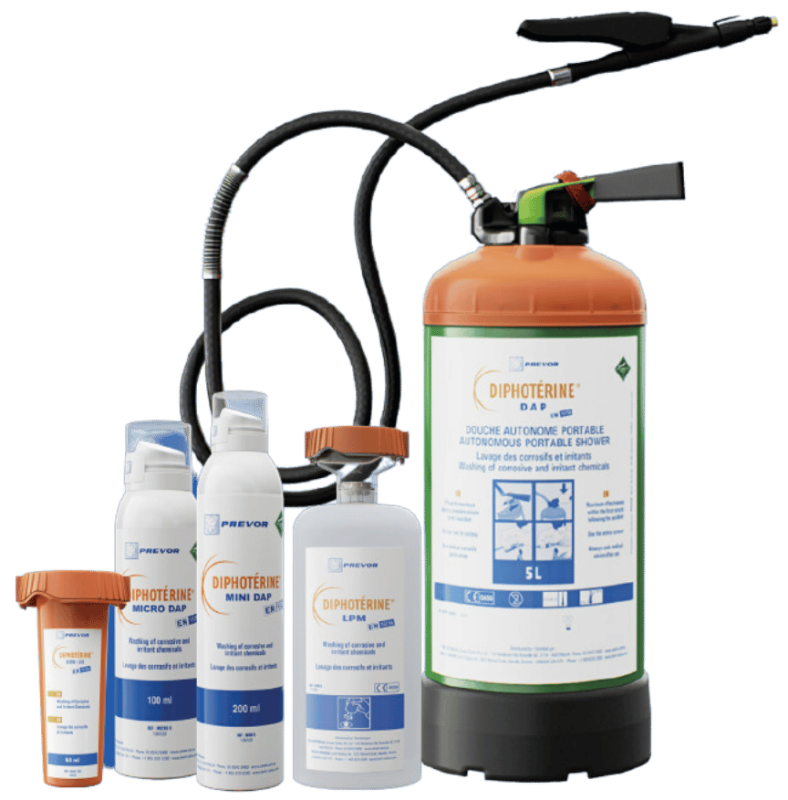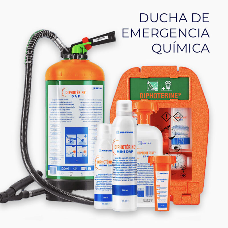 Soluciones de emergencia para proyecciones químicas en ojos y piel.