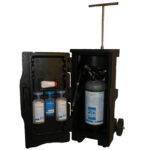 Estación completa de Hexafluorine en caja de poliuretano con ruedas, diseñada para proporcionar un sistema eficiente de lavado de ojos y cuerpo en situaciones de emergencia.