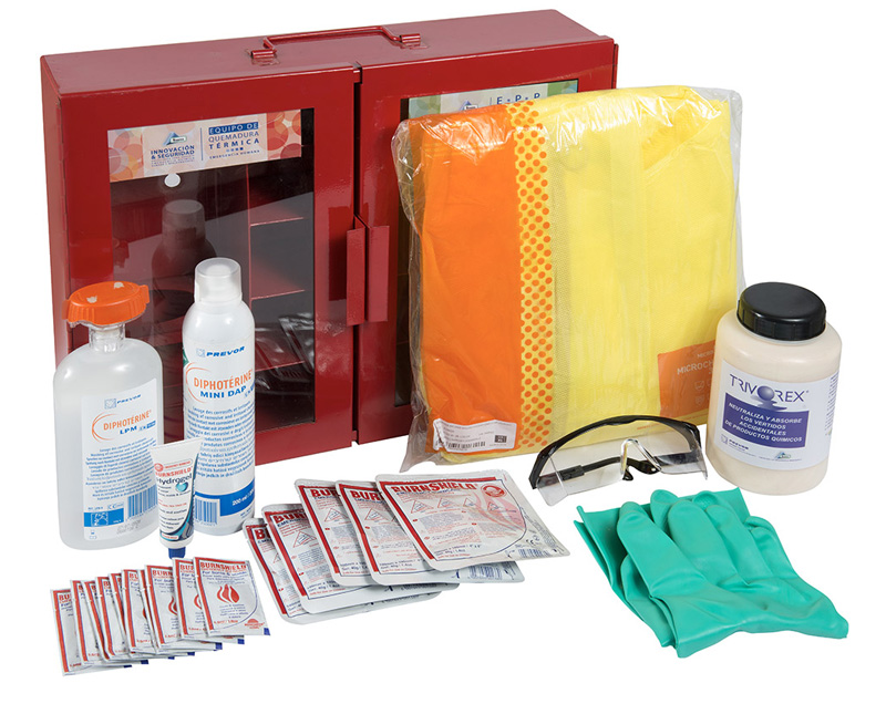 Kit completo para quemaduras térmicas y químicas en un botiquín metálico rojo, diseñado para tratar urgencias químicas y térmicas en el lugar de trabajo.
