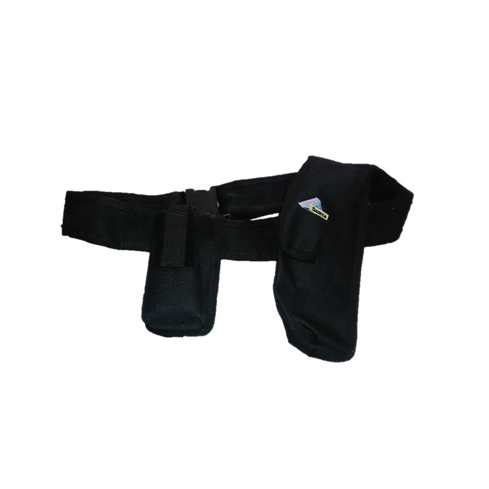 Cinturón de seguridad de tela negra con porta Mini Dap y porta radio, diseñado para mantener equipos de emergencia accesibles y seguros.