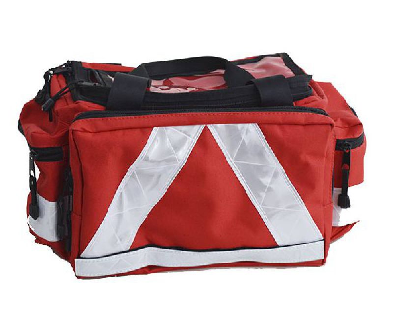 Bolso de trauma rojo con triángulo reflectante, ideal para transportar equipo de emergencia para situaciones de trauma y accidentes.