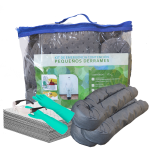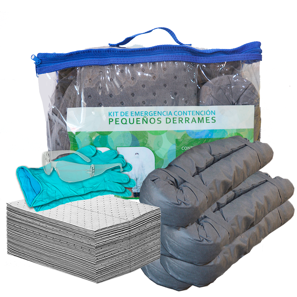 Kit de derrame universal con capacidad de 35 litros, incluye paños y barreras para contener y absorber derrames de líquidos y sustancias peligrosas.