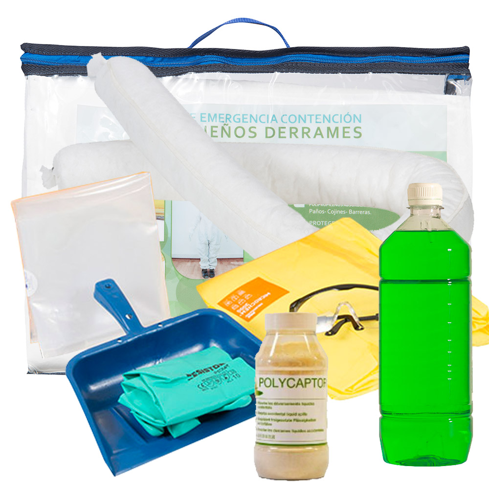 Kit de derrame ambiental para vehículos livianos, incluye materiales absorbentes y barreras con capacidad de 21 litros, diseñado para contener y limpiar derrames de líquidos peligrosos.