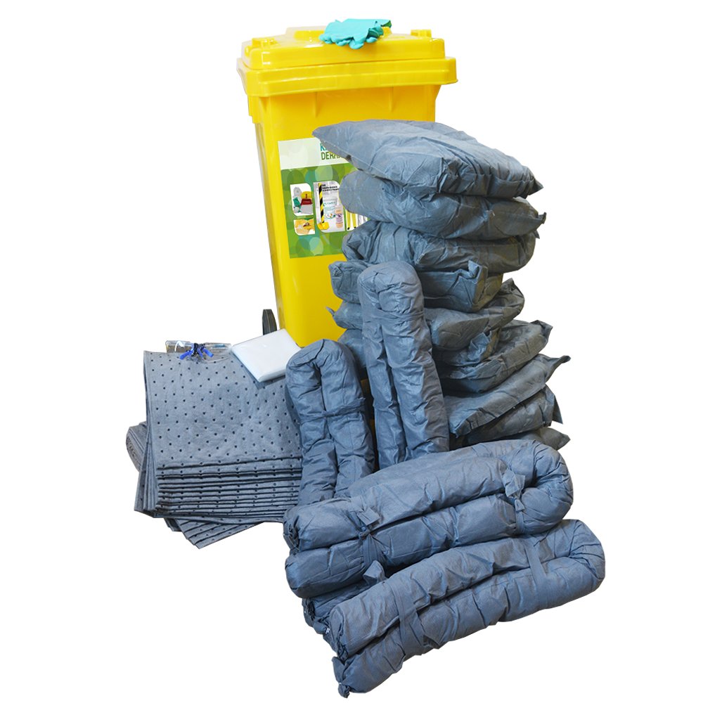 Kit de emergencia para derrames ambientales de líquidos industriales, con capacidad de 120 litros para contener y neutralizar grandes derrames de sustancias peligrosas.